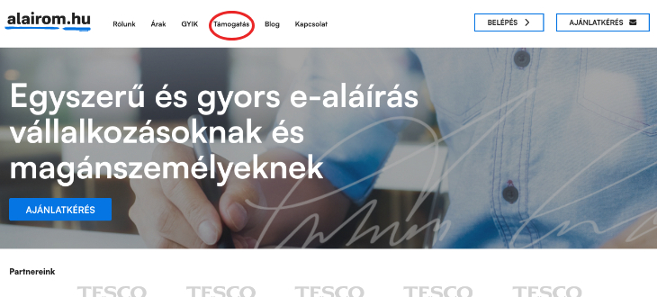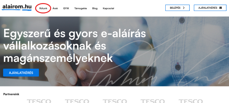 1) Főoldal: Az Alairom.hu webes szolgáltatás leírása és belépési pontja a rendszerbe a https://alairom.hu/ címen érhető el a. Az alairom.hu oldalon a fő menü sorban az alábbi információkat találja: